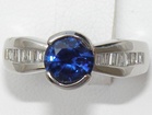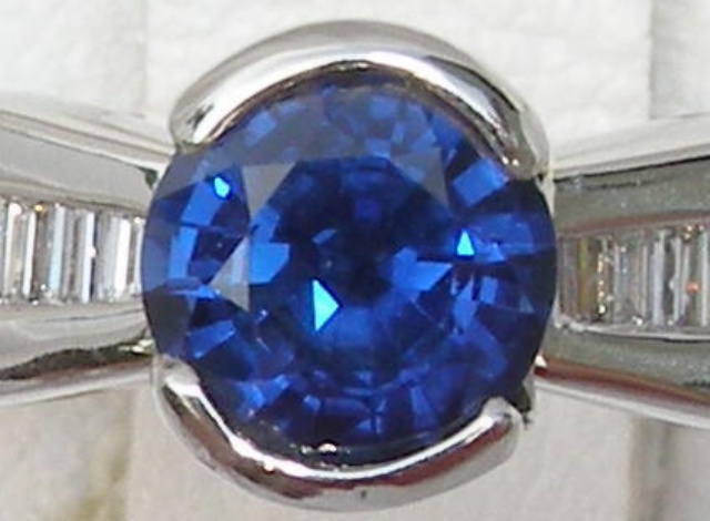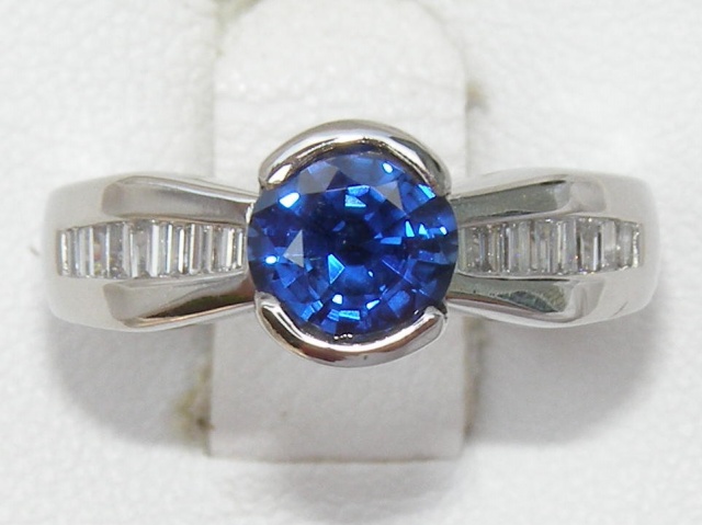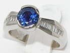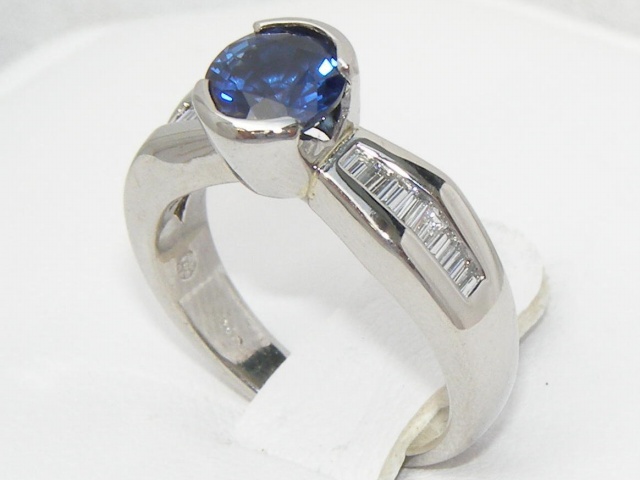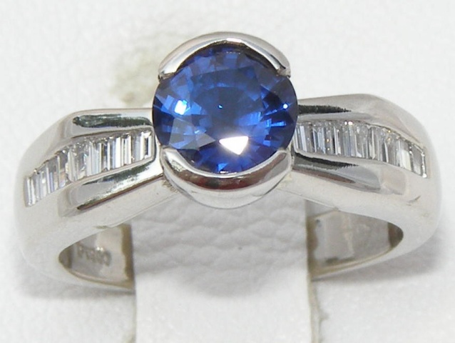This Kanchanaburi sapphire is set in a hand-made bezel that joins streamline and tailored channel settings with diamond baguettes. The tapered diamond baguettes weigh 0.24 carats total and are top rated VS2 H quality.
